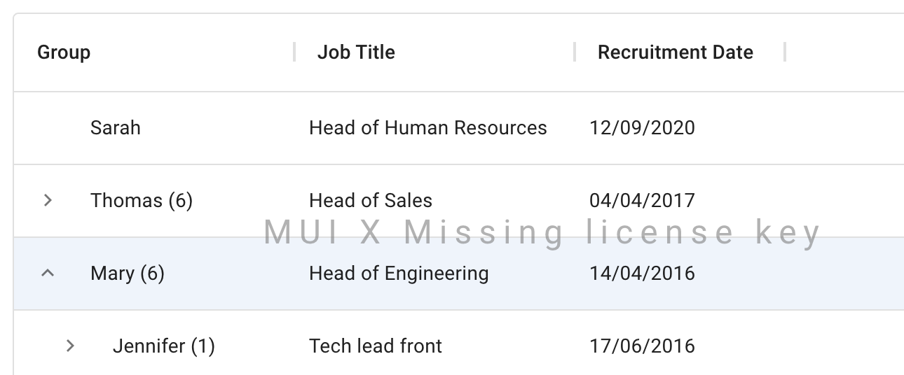 MUI X Premium unlocks the most advanced features of the Data Grid, including row grouping and Excel exporting, as well as everything offered in the Pro plan.